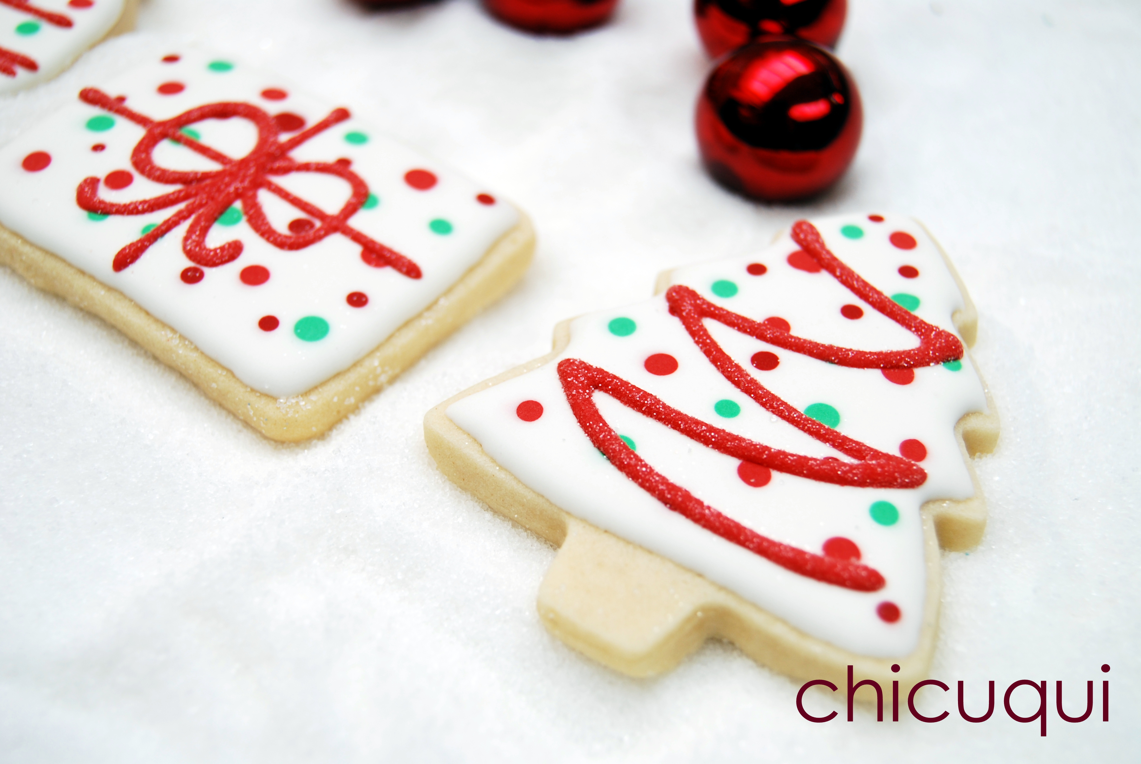 1. Hola Encarni, las líneas rojas estan hechas con glasa real o royal icing. Una vez seco el glaseado blanco de la base, dibujé con glaseado rojo las líneas y al minuto le eché azúcar normal por encima para que se quedase pegado e hiciera ese efecto brillante de sanding sugar.