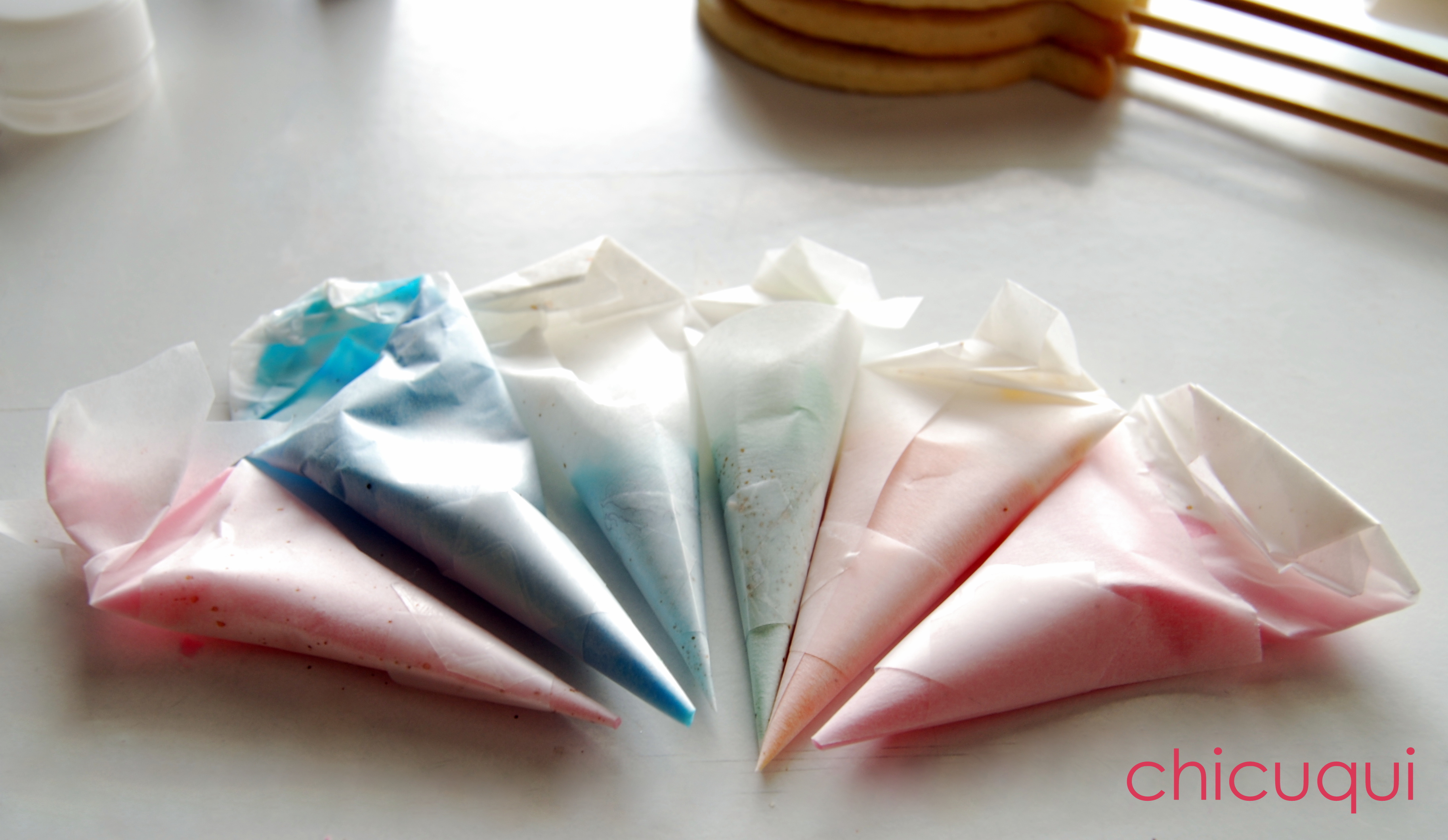 2-6. Seguidamente, utilizando las mangas de papel sulfurizado, vamos echando puntitos de glasa de colores y consistencia 10 segundos.