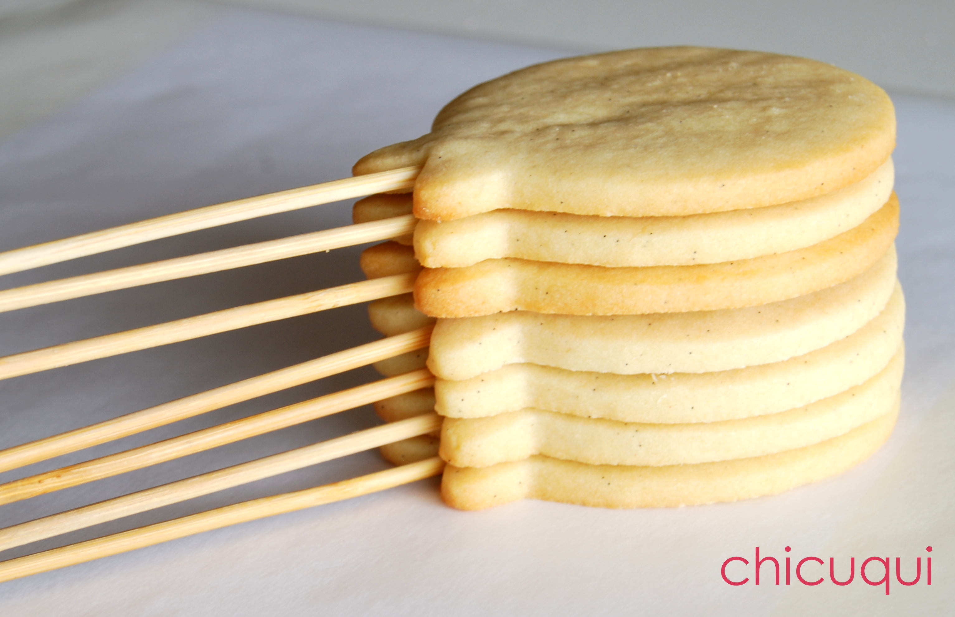 1. Hola Olga, yo horneo las galletas con el palito dentro de la masa. Las galletas tienen que tener al menos, unos 7 cm de grosor para que el palito quede dentro y que al sacarlas del horno no se rompan. Ten mucho cuidado cuando las saques ya que, al estar aun la masa blanda, se pueden romper con mucha facilidad. Saludos, Raquel.
