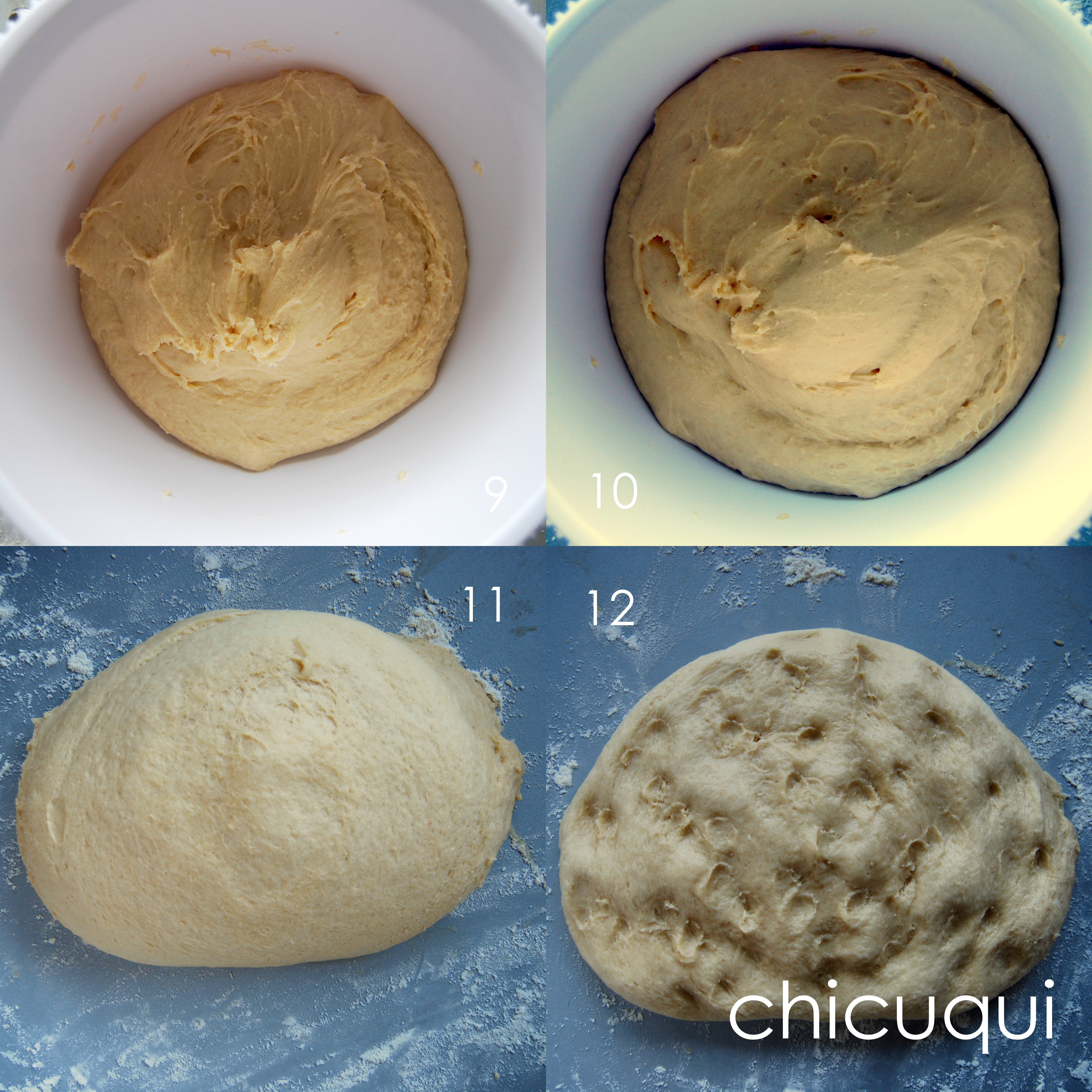 Puedes ver en las fotos la masa antes (9) y después de fermentar (10).