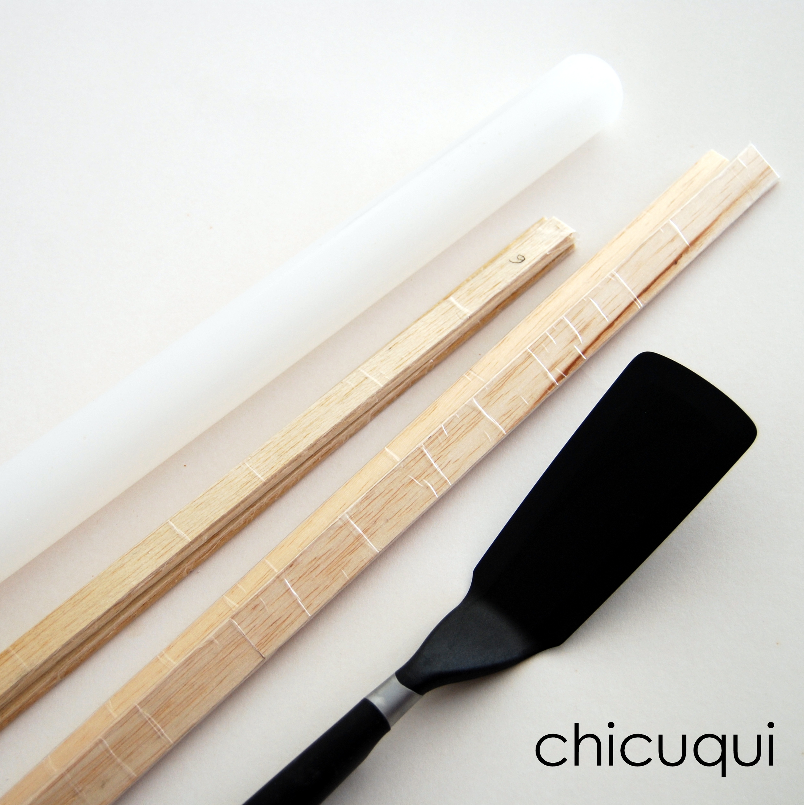 – Listones niveladores, se utilizan para que la masa se extienda uniformemente y así, las galletas tengan el mismo grosor. Los venden en juegos de listones de varios grosores. Una forma barata es comprar listones de madera y plastificarlos. Yo utilizo unos de madera de balsa ya que tienen unos grosores a partir de 1 mm y se cortan muy bien utilizando un cúter.