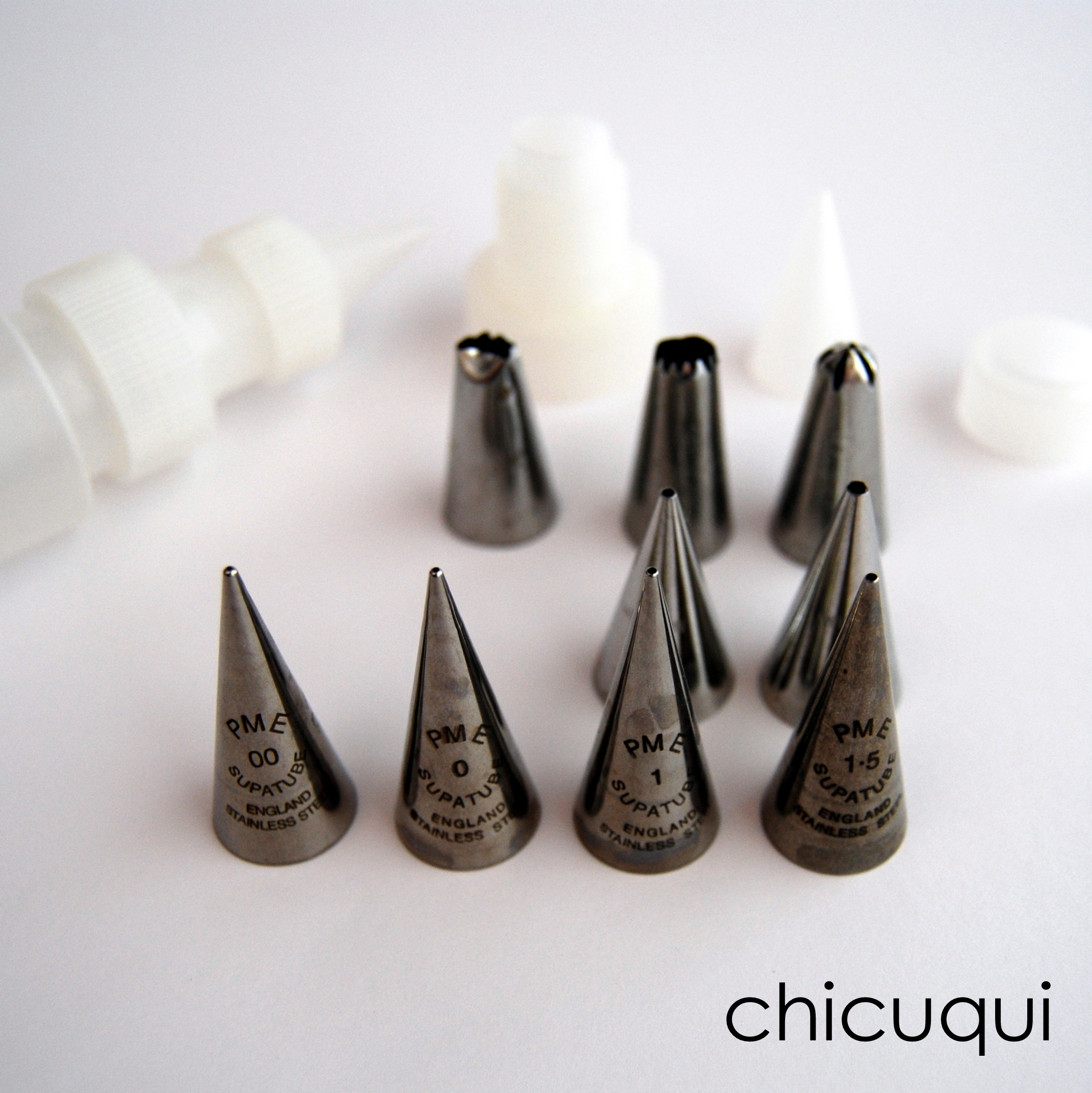 – Mangas pasteleras o biberones. Las hay también de diferentes tamaños y materiales. Utiliza una bolsa desechable de unos 30 cm, que es el tamaño estándar para decoración. Las bolsa reutilizables no son muy prácticas ya que no hay quien las limpie y las tienes que tirar igualmente. También puedes utilizar biberones. Son unos botes de plástico que llenas de glasa y a los que acoplas una boquilla. Para pequeñas cantidades de glasa son muy útiles. Si vas a hacer un pequeño detalle con un color y no necesitas mucha glasa, te recomiendo que utilices mangas hechas con papel sulfurizado. Haz un cucurucho con el papel sulfurizado y llénalo de glasa. No necesita boquilla ya que se la haces tu con el corte que le des a la punta del cucurucho. Yo las utilizo muchísimo.