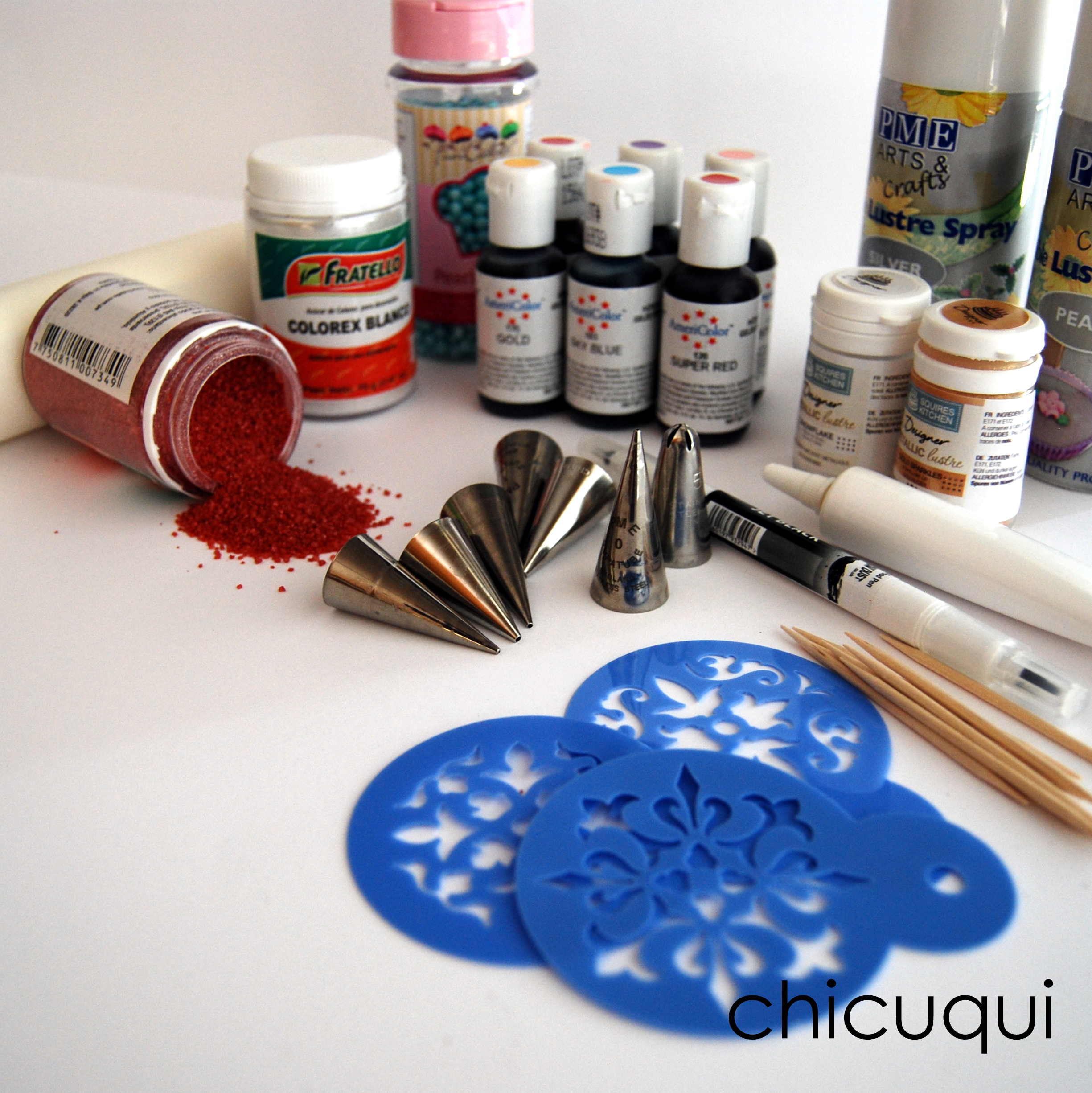 – Rotuladores de tinta comestible, azúcar coloreado, sprinkles, purpurina comestible, spray comestible, decoraciones de azúcar.
